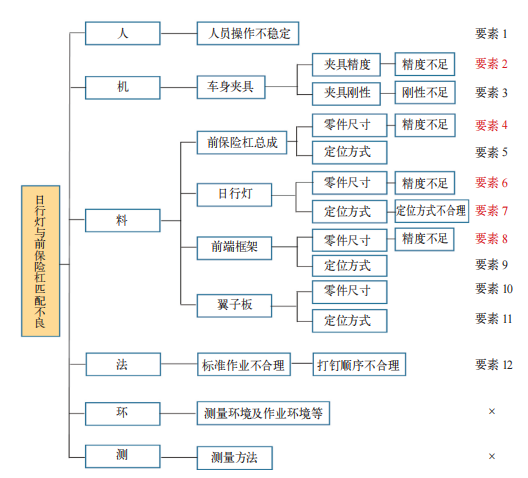 运用“人机料法环测”的系统分析方法,识别出12个可能影响前保险杠与日行灯匹配不良的要素,如图2所示。在人员方面,操作人员的不稳定操作可能导致部件安装位置不准确;在设备方面,车身夹具的精度和刚性不足会影响外饰件的定位精度;原材料方面,前保险杠总成、日行灯、前端框架和翼子板等零件的尺寸精度不达标以及定位方式不合理,都是导致匹配问题的潜在因素;工艺方法上,不合理的标准作业和打钉顺序也可能对匹配产生负面影响;环境因素如测量环境和作业环境的变化,以及测量方法的准确性,都与最终的匹配结果密切相关。