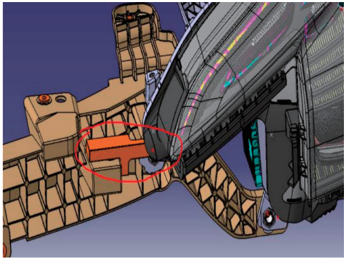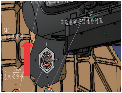 方案三是对日行灯结构进行优化,在其前部增加Z向定位点,并将定位点选择在前端框架孔上,如图5所示。这样可以确保日行灯与前保险杠定位孔在Z向的尺寸稳定,有效规避了前两种方案的缺点。该方案不仅能够保证日行灯与前保险杠之间的Z向距离稳定合格,而且从结构上解决了匹配不良的问题,具有较好的可行性和有效性。