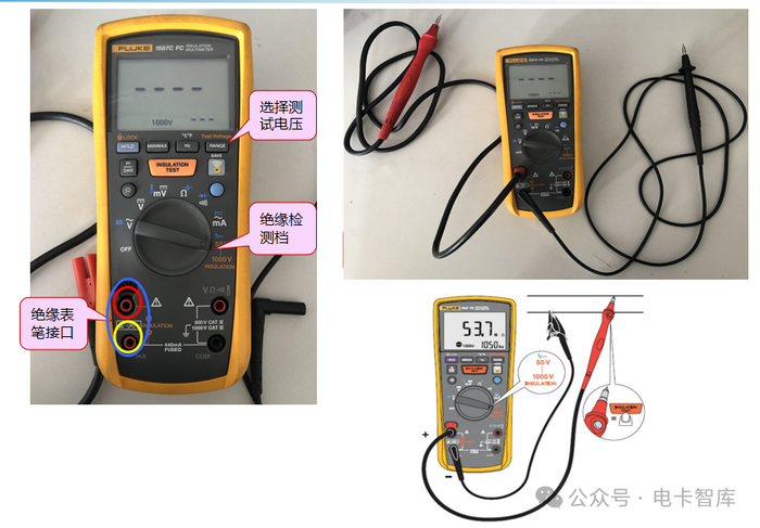 检测绝缘电阻时,档位选择绝缘检测档(选择量程1000V),负极性表笔(黑)接于零部件金属壳体或高压线束屏蔽层或整车低压负极(车架),正极性表笔(红)接于检测点,按下绝缘测试操作按钮,保持5-10秒钟后读取检测数据。