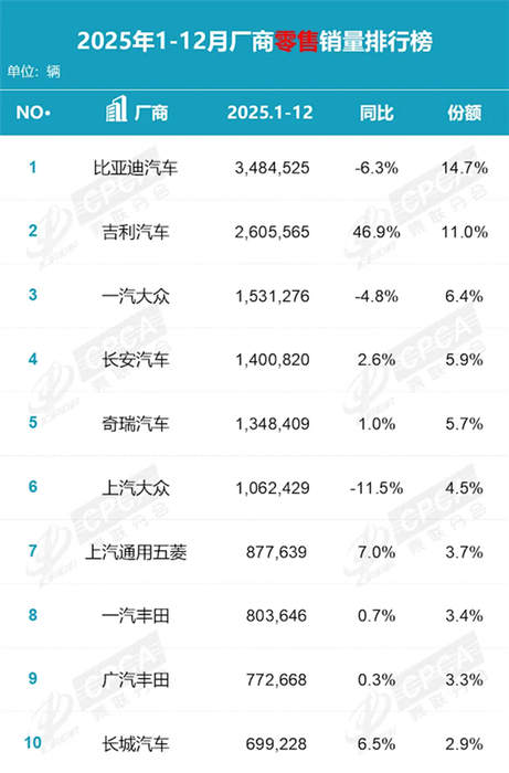 1-12月厂商零售销量排行榜显示,比亚迪汽车全年销量3484525辆,同比减少6.3%,国内市场的占比份额为14.7%,断档式领先其它品牌。