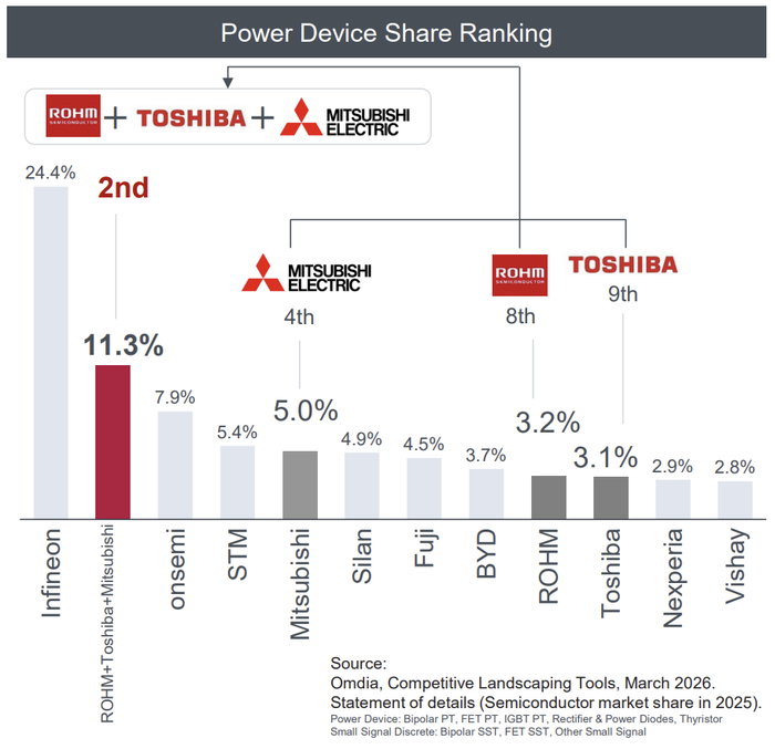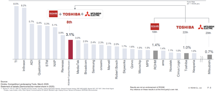 根据罗姆引用的市场研究机构Omdia于2026年3月发布的数据显示,在2025年的功率半导体市场,德国英飞凌(Infineon)以24.4%的份额位居榜首,安森美(7.9%)、意法半导体(5.4%)紧随其后,三菱电机则以5%份额排名第四,罗姆以3.2%份额排名第八,东芝以3.1%份额排名第九。来自中国的士兰微(4.9%)、比亚迪(3.7%)、闻泰旗下安世半导体(2.9%)合计拿下了11.5%的市场份额。