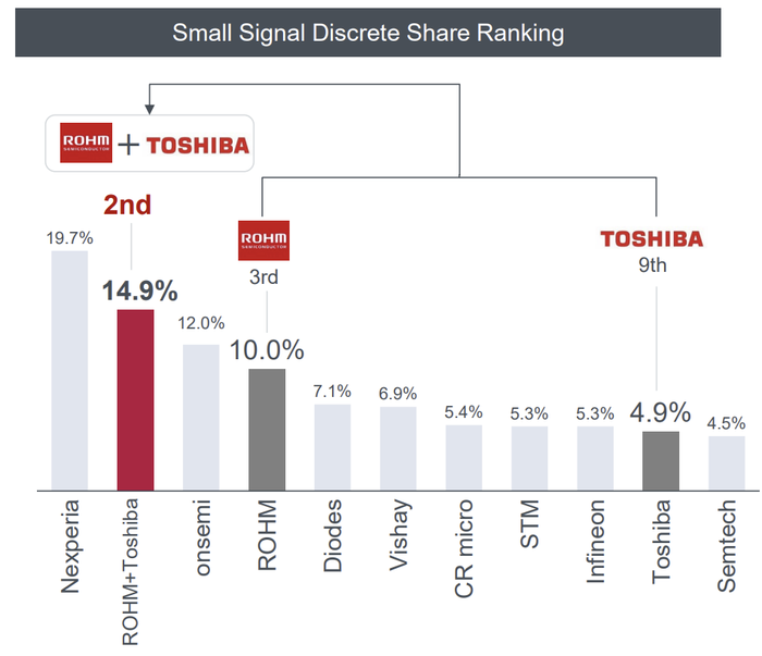此外,在小信号分立器件市场,罗姆与东芝功率半导体业务整合后,将以19.7% 的份额同样位列全球第二,仅次于安森美(onsemi)。