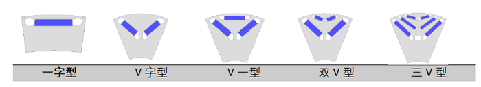 V型结构指的是磁钢在转子中的排列形式,转子拓扑经历了“一字型”、“V字型”、“V一型”、“双V型”、“三V型”等发展过程,走出了一条“大扭矩、低噪音和高效率”的“V效”曲线。