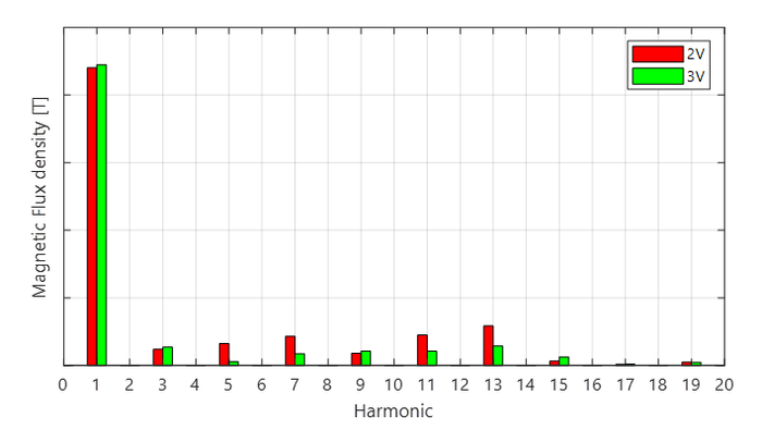在三层磁钢的调制之下,电机的气隙磁场变得更加正弦,极大抑制了各阶次的谐波,转矩波动及径向力都有显著下降,从源头上降低电磁噪音。工况效率可提升0.32%,同时改善电机NVH性能,噪音降低6~10 dB。如下图所示,相比于 “双V型”构型,“三V型”构型的主要谐波幅值明显降低50%~60%,气隙磁密THD降低50%。