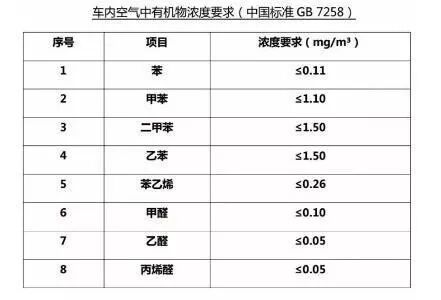 除了上面提到的成分之外,还可能会有苯、甲醛、乙醛等物质,国家对它们的最大浓度作了要求(汽车厂也会对应做四项排放、八项排放等测试)。