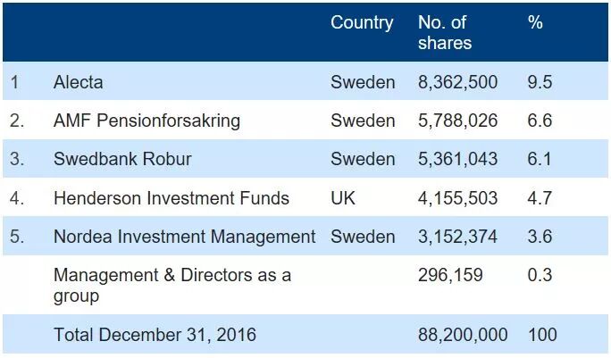 奥托立夫是一家在美国纽约证交所(NYSE:ALV)与斯德哥尔摩证交所(SSE:ALVsdb)上市的瑞典汽车零部件公司,其几个重要股东不是养老金管理公司就是投资基金公司,请见下表。