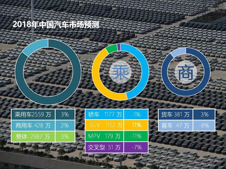 具体来说,中汽协对于2018年中国汽车市场的预测,在乘用车方面,预计2018年乘用车增速为3%,销量为2559 万辆;其中轿车销量为1177 万辆,同比下滑1%;SUV 销量1152 万辆,同比增长11%;MPV 销量为179 万,同比下滑11%;交叉型是 51 万,同比下滑7%。对于商用车市场,预计2018年商用车将整体增长2%至428万辆:客车销量为47万辆,同比下滑8%;货车销量为381万辆,同比增长3%。