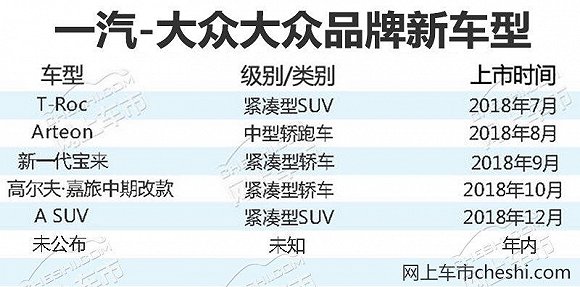 根据产品规划,2018年一汽-大众将投放A级主流SUV T-Roc、中高端 SUV、基于MQB平台的全新一代宝来、全新一代CC和新高尔夫·嘉旅 5款新产品。