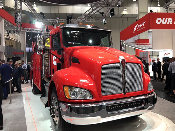 这款特有的混合动力系统,装配在康明斯展台中央展示的一台肯沃驰T370电动混合动力多用途卡车上。该车也可配置实现电网质量级别的电力输出,为其他车辆充电,同时还可成为救援起重机。