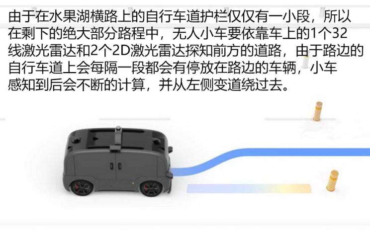 由于这条路并不是正南正北,因为无人小车在通过这条路时,一直在通过车上搭载的16个超声波雷达和1个双目相机、4个宽幅广角相机探知两侧的护栏,并不断调整行进方向。