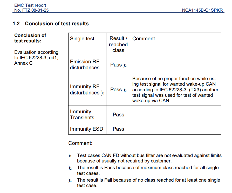 其中,IBEE/FTZ-Zwickau认证根据IEC62228-3标准进行,IEC62228-3相较于SAE J2962标准,排除了系统外围电路的影响,更聚焦CAN收发器本身的EMC特性,且要求等级更高,在除欧洲以外的车企中也得到了广泛参考应用。IBEE/FTZ-Zwickau认证包括:发射射频干扰(Emission RF Disturbances), 抗射频干扰(Immunity RF Disturbances),瞬变免疫力(Immunity Transients)和抗静电(Immunity ESD)共四项测试,纳芯微NCA1145B-Q1全部通过。
