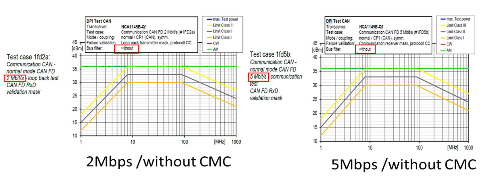 值得一提的是,测试中NCA1145B-Q1在器件级DPI(Direct Power Injection,直接射频功率注入)指标上(对应系统级BCI指标,即Bulk Current Injection,大电流注入)表现优异,通信总线在不需要额外配置共模电感滤波的情况下,仍可通过标准要求的最高功率,在保障系统鲁棒性的同时,可帮助用户减少系统外围电路,降低成本。