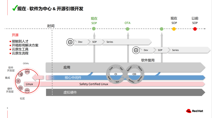 传统的开发流程过于依赖硬件,而红帽主张采用以软件为中心的开发方法,也就是说,从项目启动之初就开始软件开发,与硬件完全解耦。过去,车厂必须先确定硬件,再根据硬件开发软件,而现在,我们可以将软件设计抽象出来前置开发,这一转变正得益于Linux这一关键技术。