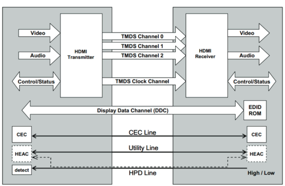 HDMI接口可以划分为四种类型:Source(源设备)、Sink(接收设备)、Cable(线缆)和Repeater(中继器)。为了保证这些设备之间的良好兼容性,规范对电气信号提出了信号完整性的要求。HDMI接口使用TMDS(Transition Minimized Differential Signaling,最小化传输差分信号)编码技术,包含4对TMDS差分信号,其中TMDS.Clock.channel作为独立的时钟信号,用于同步和信号采集;TMDS.channel.0/1/2作为数据通道,用来传输视频和音频数据。例如,HDMI 2.0定义了每个通道最高6Gbps的速率,接口的总带宽最高可达18Gbps,能够满足4Kp60Hz所需的17.82Gbps带宽。
