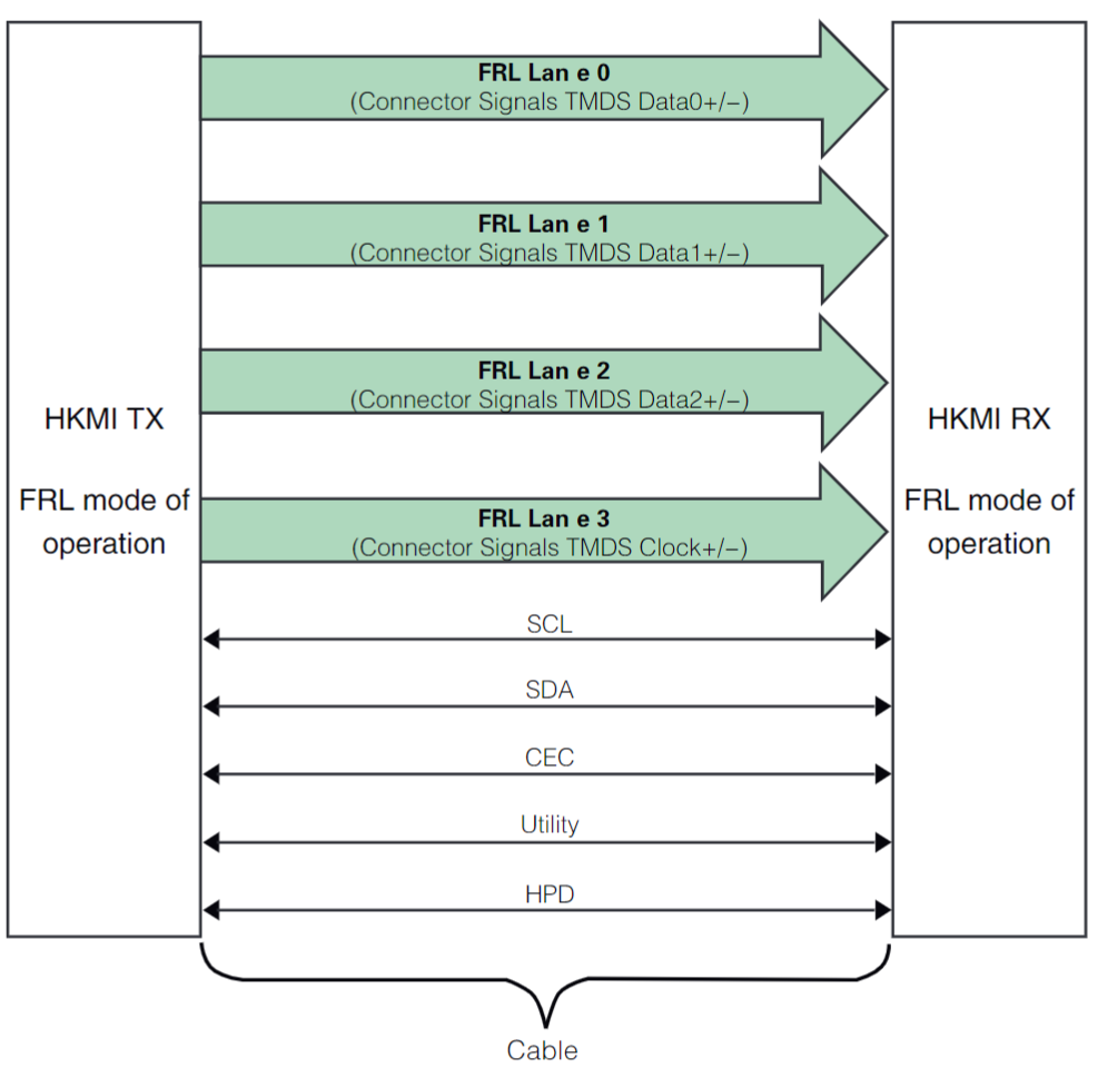 随着人们对视觉体验要求的不断提高,4Kp60Hz的显示分辨率已无法满足需求,8Kp60Hz和4Kp120Hz的体验成为新的追求目标。然而,8Kp60Hz所需的带宽约为64G(RGB/YCbCr 4:4:4格式),远远超出了HDMI 2.0的支持范围。为此,HDMI协会引入了HDMI 2.1 FRL(Fixed Rate Link,固定速率链路)模式,通过提升通道数据速率和增加通道数量,实现了接口带宽的增加,满足了8Kp60Hz的需求。在保持HDMI物理接口不变的情况下,每个通道支持的速率增加到了12Gbps,同时,原来的TMDS.Clock.channel被重定义为FRL.Lane3,共计有4个数据通道,从而实现了最高48Gbps的带宽。信号的编码方式也从TMDS的8b/10b改变为FRL的16b/18b格式,提高了编码效率。