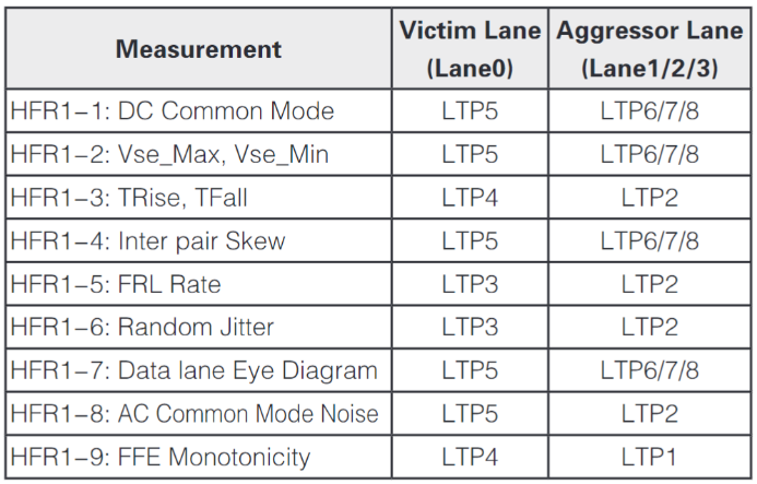 HDMI 2.1的测试项目众多,以测试Lane0为例,测试信号是固定的码型,规范定义了8种码型Link training pattern 1~8,简写为LTP1~8,与HDMI 1.4b/2.0不同,对码型有明确要求。测试信号速率固定,不随分辨率变化。此外,还需要考虑其他lane的干扰,例如在HFR1-1项目中,测试Lane0时,需要Lane0发出LTP5码型,Lane1/2/3分别发出LTP6/7/8的码型,测试方法更为复杂。