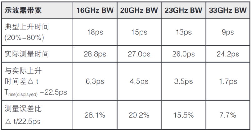 从下表可以看到,带宽越高,上升时间的测量误差就越小。