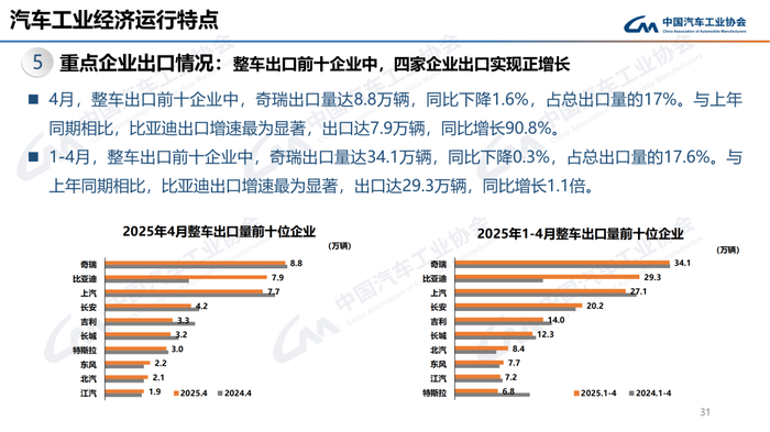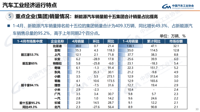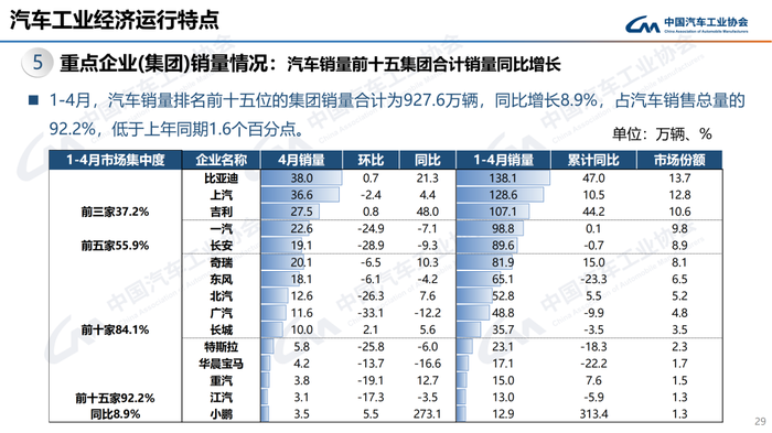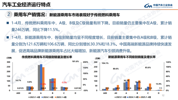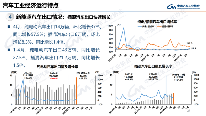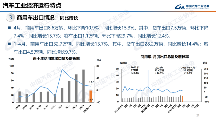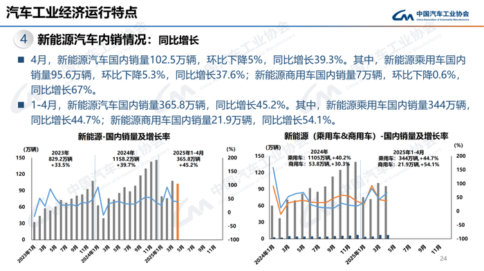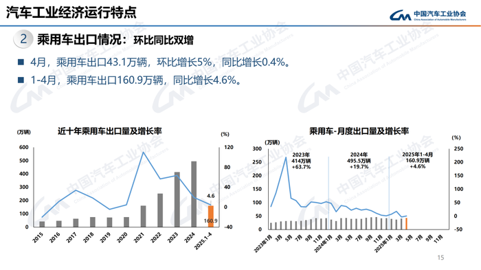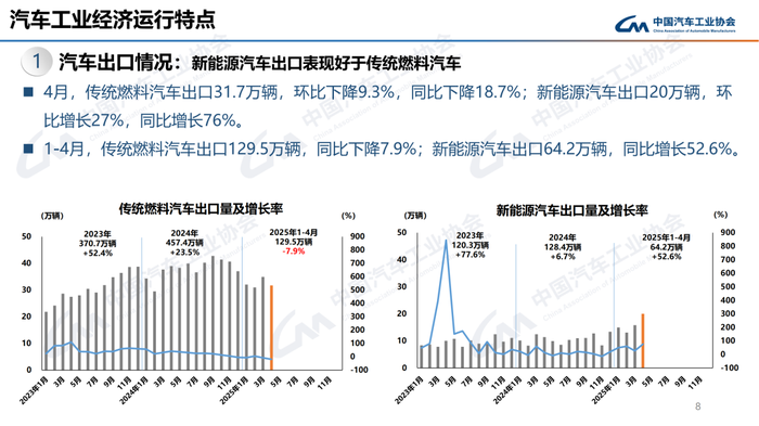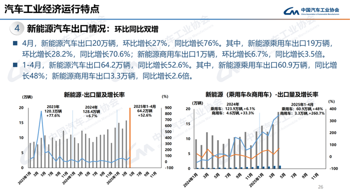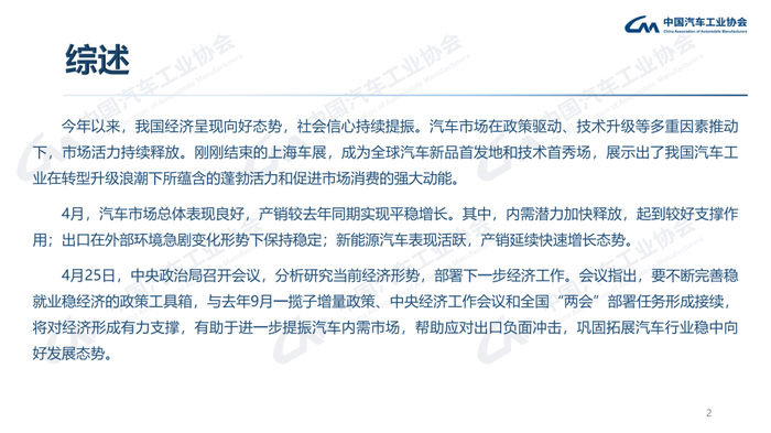 4月,汽车市场总体表现良好,产销较去年同期实现平稳增长。其中,内需潜力加快释放,起到较好支撑作用;出口在外部环境急剧变化形势下保持稳定;新能源汽车表现活跃,产销延续快速增长态势。