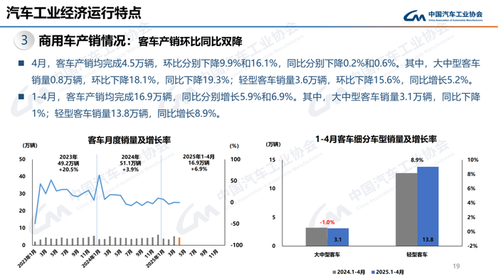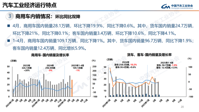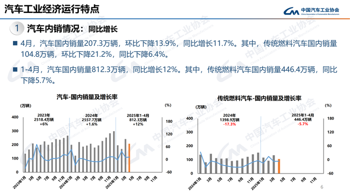 4月,汽车产销分别完成261.9万辆和259万辆,环比分别下降12.9%和11.2%,同比分别增长8.9%和9.8%。
