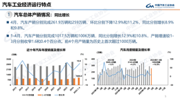 4月,汽车产销分别完成261.9万辆和259万辆,环比分别下降12.9%和11.2%,同比分别增长8.9%和9.8%。