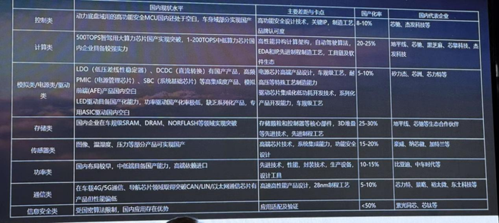 会上,徐志刚还展示了一张图,清晰呈现了国内汽车芯片的现状、主要差距与卡点、国产化情况、国内代表企业。