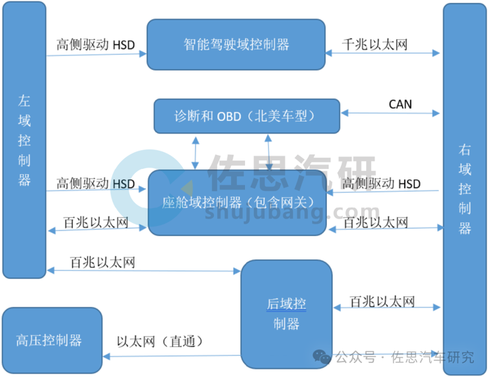 高侧驱动HSD也叫高边驱动,开关元件位于 Vcc 和负载之间,低边驱动开关元件位于负载和公共端之间,高边驱动通常用于比较精密的器械,略微复杂,一般带自举电路,通常BMS或MCU有多个HSD端口。上图中座舱域控制器,特斯拉称之为MCU,其和诊断部分有两路以太网连接。