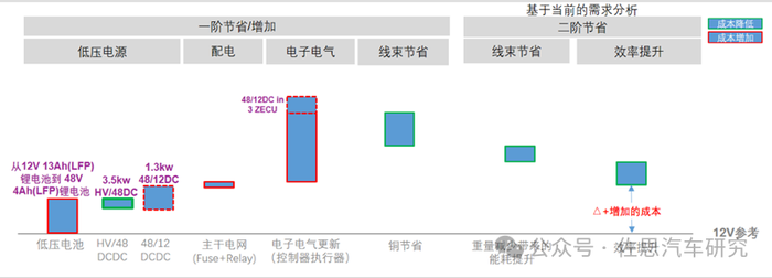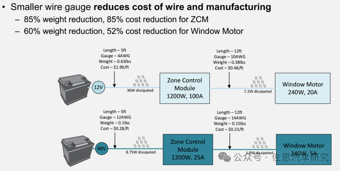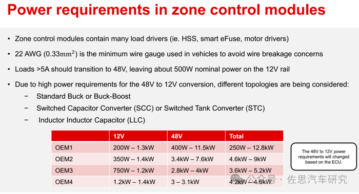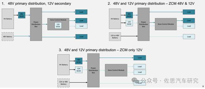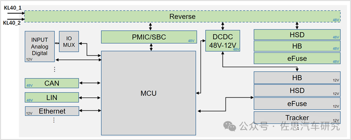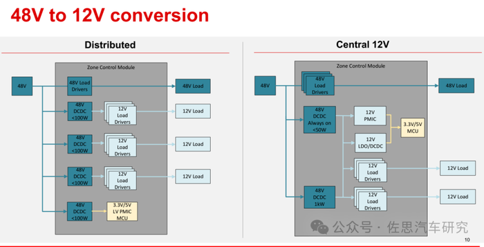 目前,全车采用48V系统完全不可能,硬件成本、开发成本、试验测试成本和验证成本都会很高,很多元器件需要定制,成本很高。目前必须采取混合配电架构,即一级配电使用传统保险,二级配电通过区域控制器实现电子配电。同时该车上大部分50W以上低压负载从12V升级为48V,其余保持12V不变。