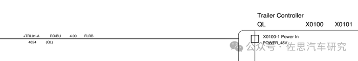 拖车系统控制器,左边连接后域控制器,48V系统特别点明,连接线缆上的代码和数字都有含义,TRL代表拖车控制器,O1代表ID,RD/BU代表线缆颜色是红/蓝,4.00代表线面积为4平方毫米。