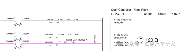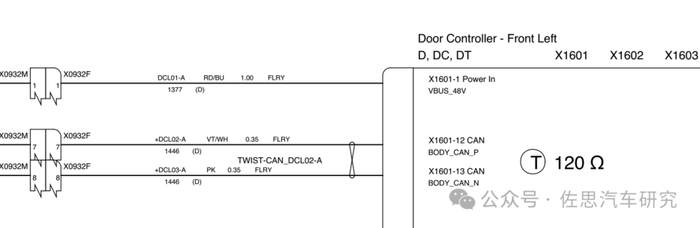 右前门控制器,与前左一样,左边连接右域控制器。左后门和右后门控制器,都是如此,连接后域控制器。