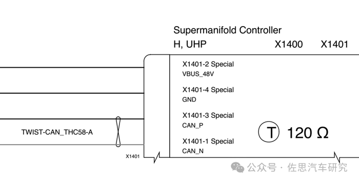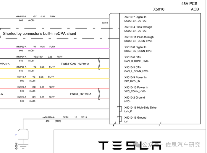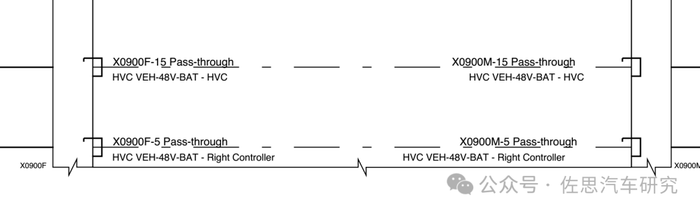 特斯拉有一个48V功率转换盒子,接线如上图,左边连接高压控制器。外壳接地,线截面积非常高,有13平方毫米。此外,后域控制器到右域控制器之间也有一条很粗的48V线缆,线截面积有10平方毫米,也很高。