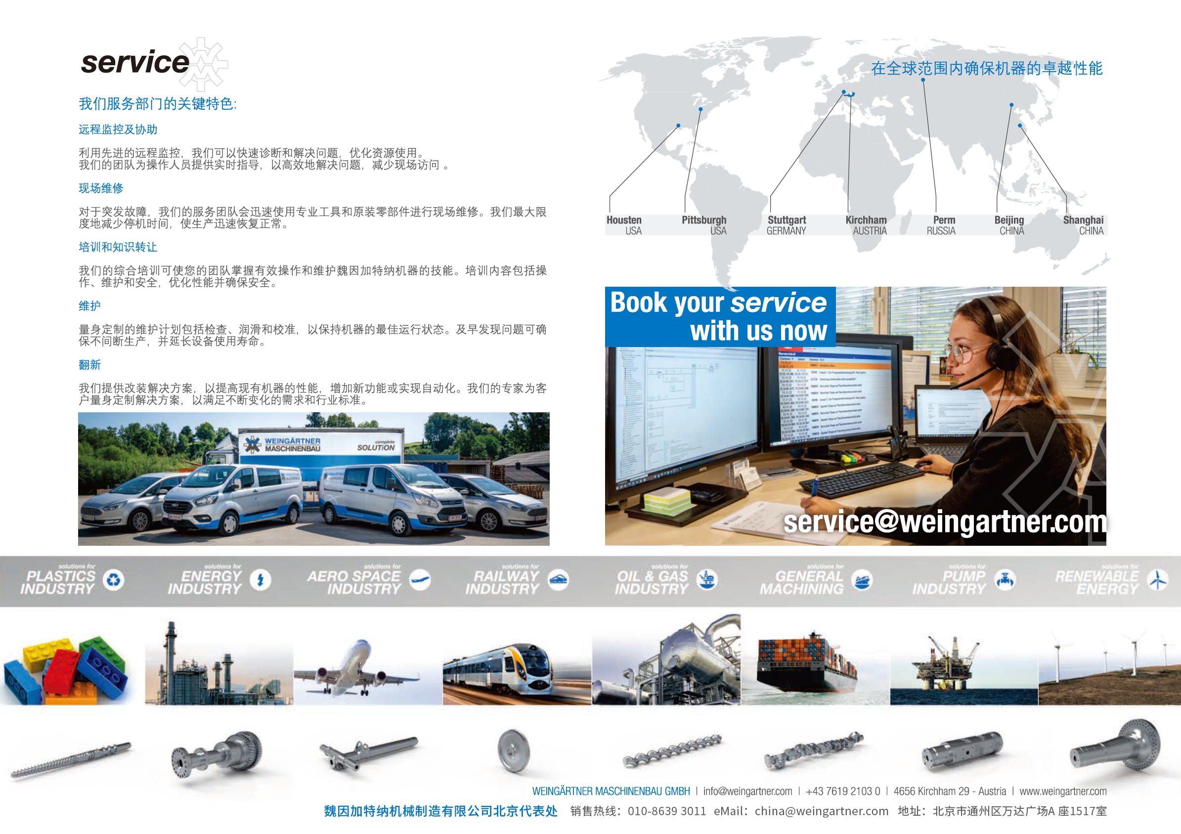 早在1980年代,魏因加特纳公司首台设备登陆中国,设备类型为螺杆零件加工设备。随着魏因加特纳公司在华业务的壮大和了解中国客户的需求,魏因加特纳公司在2017年在北京成立奥地利魏因加特纳机械制造有限公司北京代表处,至今为止有着8年的历史。为了更好地支持中国市场、提供更加快速高效的服务,4年(2021)前,魏因加特纳(太仓)贸易有限公司正式成立,标志着我们全球服务网络的进一步扩展。作为魏因加特纳集团服务体系的本地化延伸,我们始终致力于为中国客户提供快速响应、量身定制的技术支持和零距离服务保障。