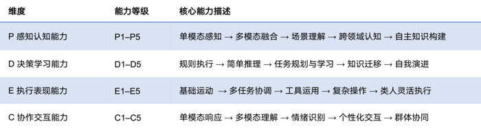 这是全球首个人形机器人智能化能力分级的标准,通过借鉴自动驾驶、工业机器人等分级逻辑,并针对人形机器人的特殊性进行了创新,构建形成 “四维五级” 的评价框架。包括“感知认知(P)、决策学习(D)、执行表现(E)、协作交互(C)” 为核心的四大能力维度,并构建 L1-L5 五级智能化能力分级体系。