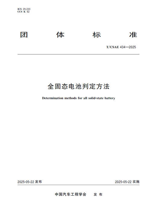 2025年5月22日,中国汽车工程学会正式发布《全固态电池判定方法》(T/CSAE 434-2025),该标准首次明确了“全固态电池”定义,要求离子传递完全通过固体电解质实现,与混合固液电解质电池形成严格技术分界。该标准由中汽研新能源汽车检验中心(天津)有限公司牵头联合50多家单位共同起草,旨在解决行业对全固态电池定义模糊、液态物质含量测试方法缺失等问题,为全固态电池技术升级和产业化应用提供科学依据,通过团体标准先行先试也为后续全固态电池国家标准制定提供实践支撑。