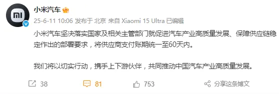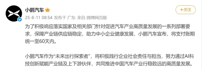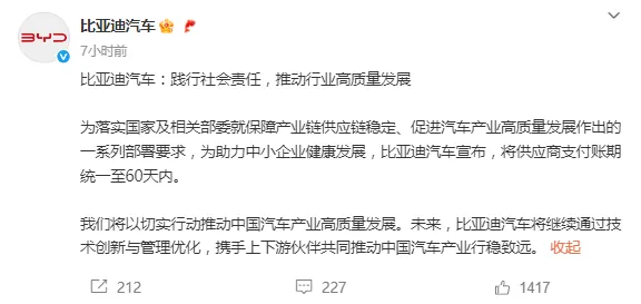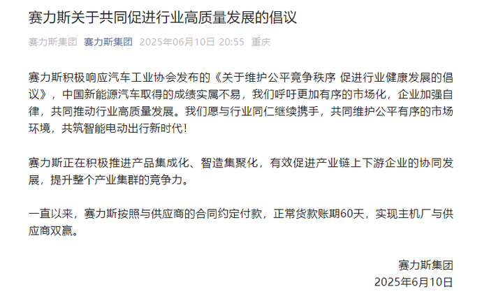 赛力斯集团发布了《关于共同促进行业高质量发展的倡议》,呼吁“更加有序的市场化,企业加强自律”。比亚迪在6月11日凌晨通过官方微博宣布,将通过技术创新与管理优化实现60天账期。