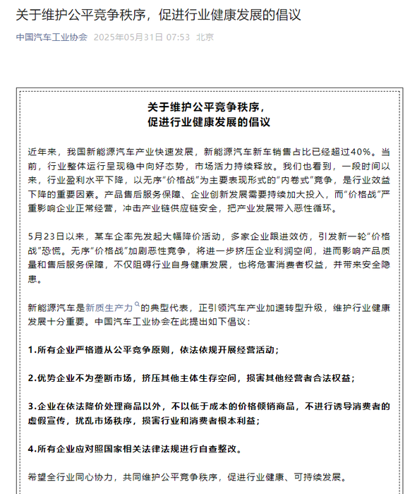 政策刚性与行业自律形成共振效应。5月31日,中汽协发布《关于维护公平竞争秩序促进行业健康发展的倡议》,呼吁建立依法履约的信用体系。二者形成政策闭环:前者设定法律底线,后者构建道德共识。