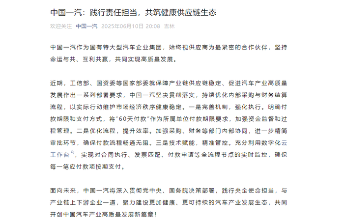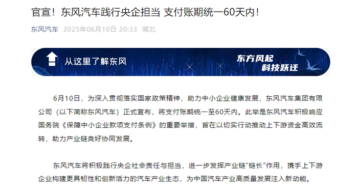 6月10日晚间,中国汽车行业迎来了一场静悄悄的变革。四家主流车企——中国一汽、东风汽车、广汽集团和赛力斯集团几乎同时发布声明,承诺将供应商支付周期统一控制在60天以内。