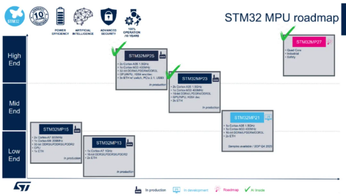 意法半导体近期宣布STM32MP23x产品线(涵盖STM32MP235、STM32MP233及STM32MP231)已正式面向大众市场量产销售。继一年前推出STM32MP25系列后,全新发布的STM32MP23x系列聚焦于成本敏感型工业应用场景,同时保留神经处理单元(NPU)、异构架构(Cortex-M33与双核Cortex-A35)、支持Linux与实时操作系统(RTOS)、带时间敏感网络(TSN)的高性能网络接口等核心功能。简而言之,STM32MP23x新系列产品让边缘机器学习变得触手可及,尤其是仅需16位DDR4/LPDDR4/DDR3L内存控制器及无需视频流编码的H.264硬件解码的应用场景。