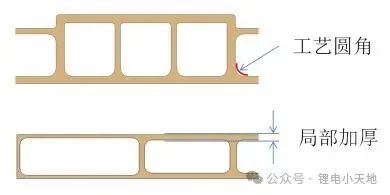 若选用压铆件或嵌入式标准件,设计型材截面时需要考虑安装面的厚度、高度和是否能承受铆接时的垂直向压力。铝型材动力电池箱体边框型材截面设计,需要结合箱体与上盖的密封和固定方式来设计法兰面宽度和型腔高度。
