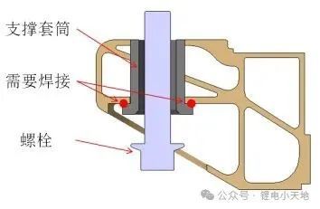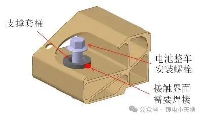 动力电池与车身连接位置通常设计在铝型材拼焊箱体的边框上,若边框型材的截面设计在垂直向上没有支撑,则需要参考图3的安装点设计示例,在边框上开通孔,加装“T型”支撑套筒,套筒的法兰面需要与边框接触的贴合面进行焊接,焊接后焊缝余高不影响螺栓安装。支撑套筒设计完成后,需要校核套筒的受力情况。型材截面设计时还需要考虑电池箱体定位销/孔的预留位置和安装方式,两个定位销/孔需要分别布置在铝型材动力电池箱体的对角线位置上。
