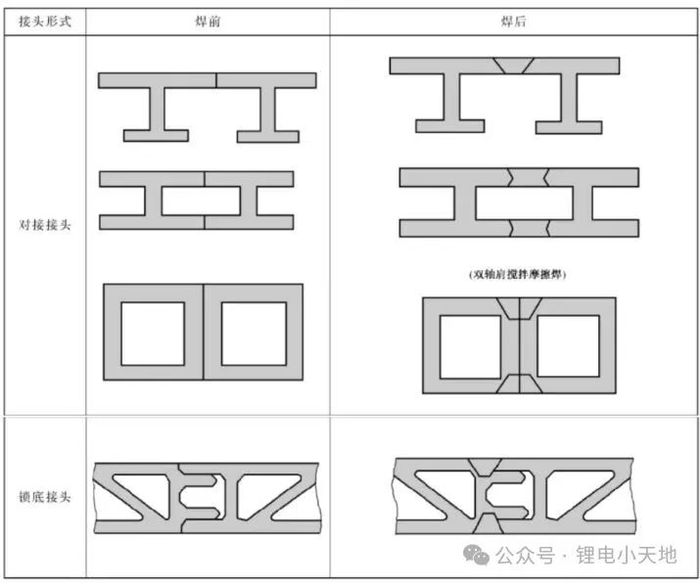 搅拌摩擦焊常用的焊接接头形式如图4、5所示。接头的设计和搭接方式,需要考虑型材的壁度、焊接前后零组件的平面度和焊缝的受力情况,并通过仿真分析校核接头设计的可靠性。