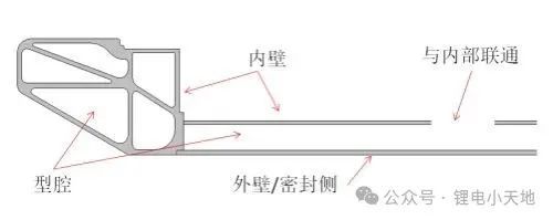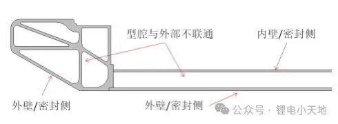 1)若铝合金挤压型材内壁与型腔联通,则型材暴露于外界环境的外壁为密封侧,铝型材动力电池箱体为外密封。建议铝型材外壁即密封侧的壁厚考虑加厚加强,有石击、托底风险的密封侧,型腔外壁不允许有开孔,箱体焊接需要满足气密检测要求;