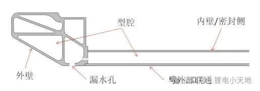 2)若铝合金挤压型材型腔与外界环境联通,则型材内壁为密封侧,铝型材动力电池箱体为内密封。要求铝型材型腔外壁设计有漏水孔,避免泥沙水流进入型腔后无法自然流出造成腐蚀。箱体内壁焊接要求满焊,同时满足气密检测要求;