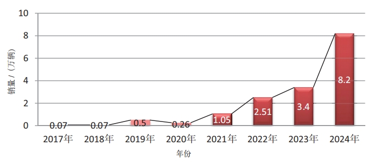 在全球汽车行业向电气化转型的大背景下,纯电动重卡因其显著的环保优势,如噪声小、零排放和能量来源多样化而受到广泛关注。2017~2024年国内纯电动重卡销量呈加速增长趋势,如图所示(中国数据来源于中汽协),且表现出大电量、多种布置方式并存的特点。电量方面,400kW·h左右最受欢迎,600kW·h及以上电量车型逐渐增多。因重卡的使用场景、载重属性,电池系统的高效布局及其制造技术是决定纯电动重卡性能的关键因素。