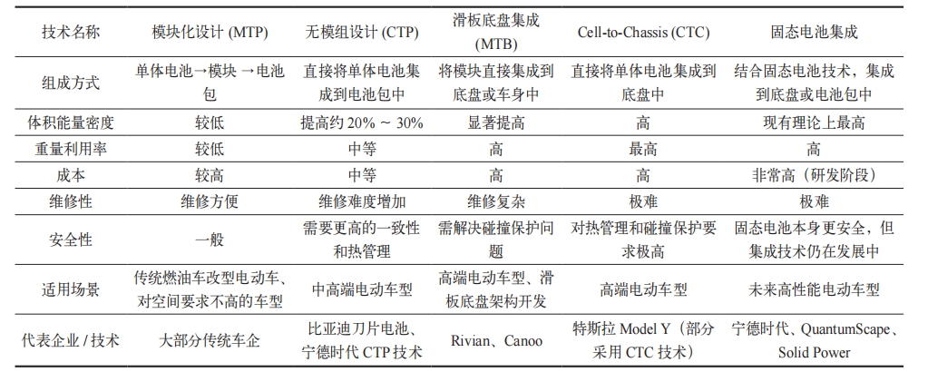动力电池作为核心部件之一,其设计和集成方式直接影响整车性能、成本以及安全性。动力电池包的结构形式是电池系统设计的重要环节,常见的结构形式包括模块化设计(Module-to-Pack,MTP)、无模组设计(Cell-to-Pack,CTP)以及最新的滑板底盘集成(Module-to-Body,MTB)等。各种结构集成方式在能量密度、容量利用率和成本等多维度上的对比见表1。