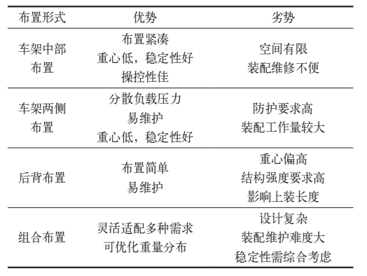 因细分市场需求,纯电动重卡动力电池布置形式存在多样性,如车架中部布置、车架两侧布置、后背布置和组合布置等,不同布置形式也存在各自的优劣势,设计人员可根据实际运营需求、维护便利性、安全性和成本效益需求选择合适的布置方案,见表2。