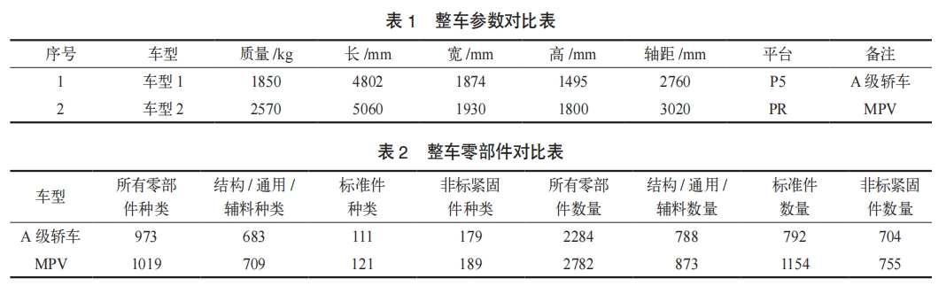 以某A级轿车与某MPV共线生产为例,在整车尺寸、配置及参数等各方面相差较大,零部件数量、种类和相似性等差别非常大,见表1、表2。