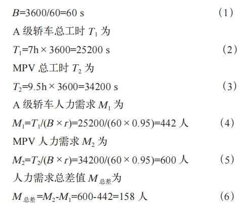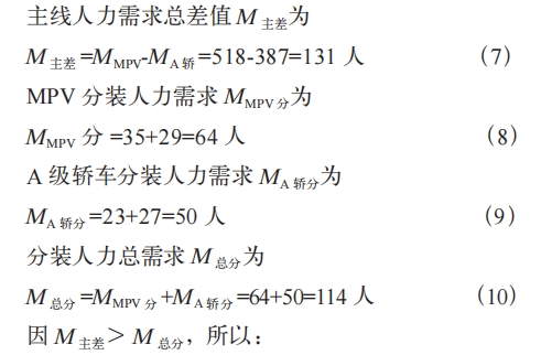 经计算,MPV上线生产需求人力约600人,A级轿车上线生产需求人力442人,也就是说两车型混线生产时,当A级轿车生产时,近158人处于赋闲状态,存在严重人力浪费。