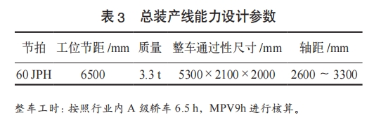 运用ECRS法则,为保证主线工位平衡,按照装配可替代方式、主线工位工时替代方式及减少主线生产件数量方式(比如推动总成供货或分装总成上线)。保证生产产量按照主线设备满节拍规划方式,工艺规划同步考虑物流空间要求。为保生产过程质量建立工位内防错方法等多角度制定应对挑战的措施,保证多平台多车型混线生产实现满节拍,保质量、保过程和减少混线的影响。本文中总装产线设计参数见表3。