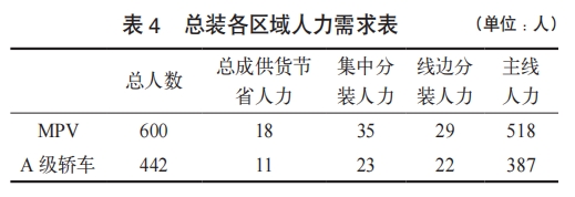 A级轿车依据同上分析得出各区域人力需求,综上汇总见表4,总装各区域人力需求如下。