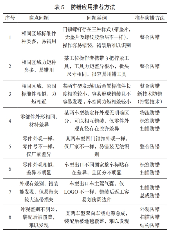 总装多平台多车型混线生产,存在诸如多车型间相似件、关联件混用,易发生质量问题,一般存在八大痛点问题。针对共线痛点问题,提出八大防错方法进行规避,包括外观防错、标签防错、物流防错、结构防错、扫描防错、新技术防错、整合防错以及总成防错,见表5。